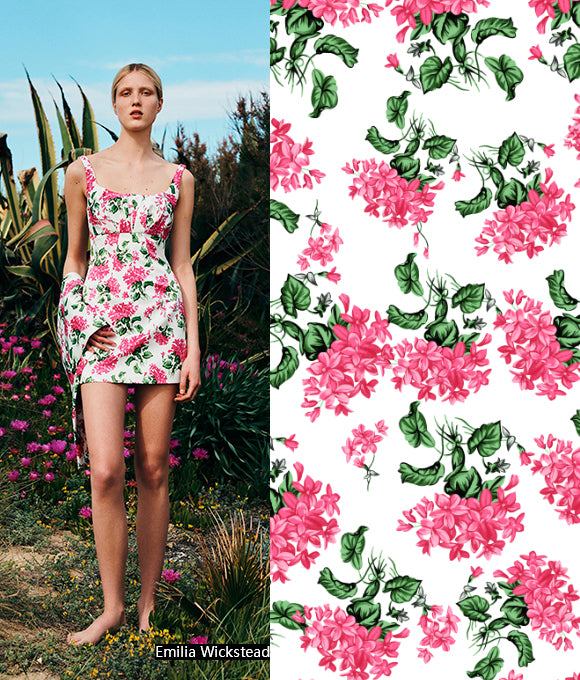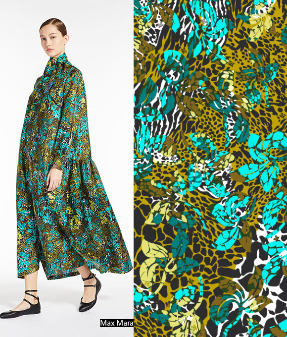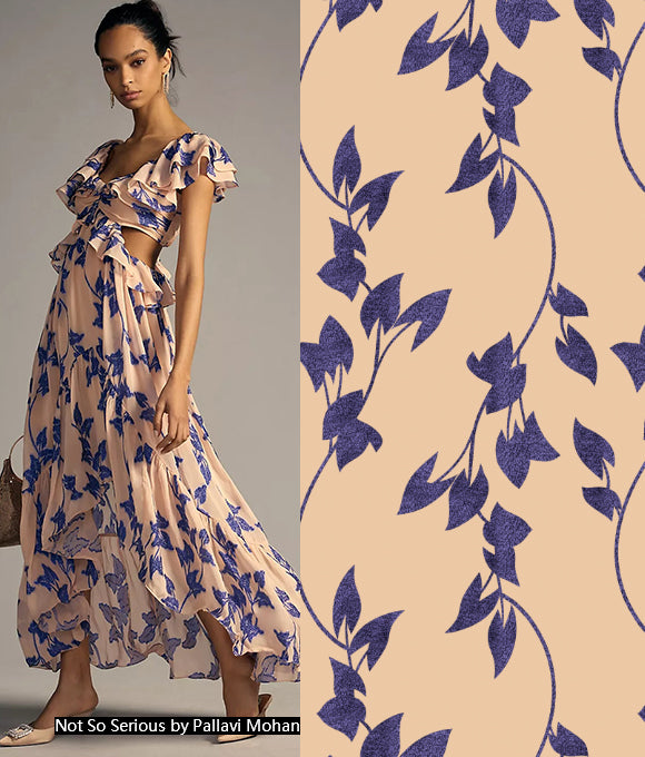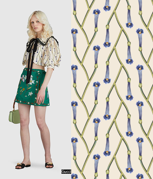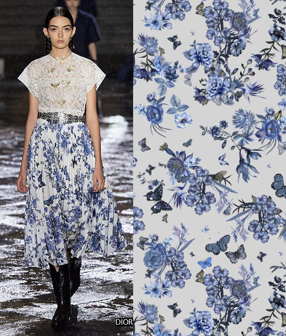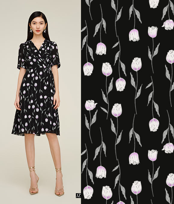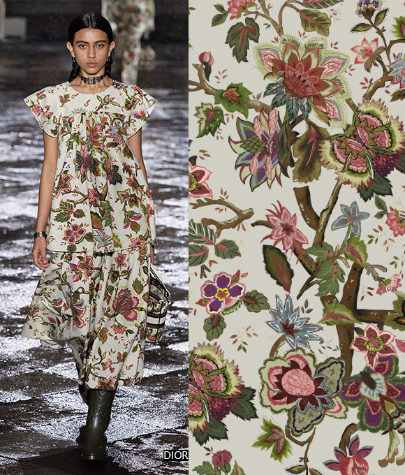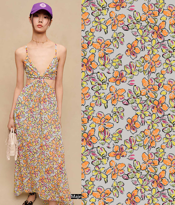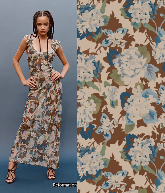 Un diseño nítido, realista y con textura, lleno de detalles. Los grandes racimos de flores están superpuestos en capas profundas y superficiales, creando una sensación romántica y sofisticada. Los límites entre los patrones florales están dispuestos de manera desordenada y con una textura delicada y tridimensional, lo que amplía las posibilidades del diseño floral. Los colores iridiscentes y los difuminados psicodélicos de alta moda añaden un fuerte sentido de movimiento y sofisticación fría. La paleta general de colores es variada en profundidad, evitando quedar atrapada en un solo tono, mejorando así la elegancia general del diseño.